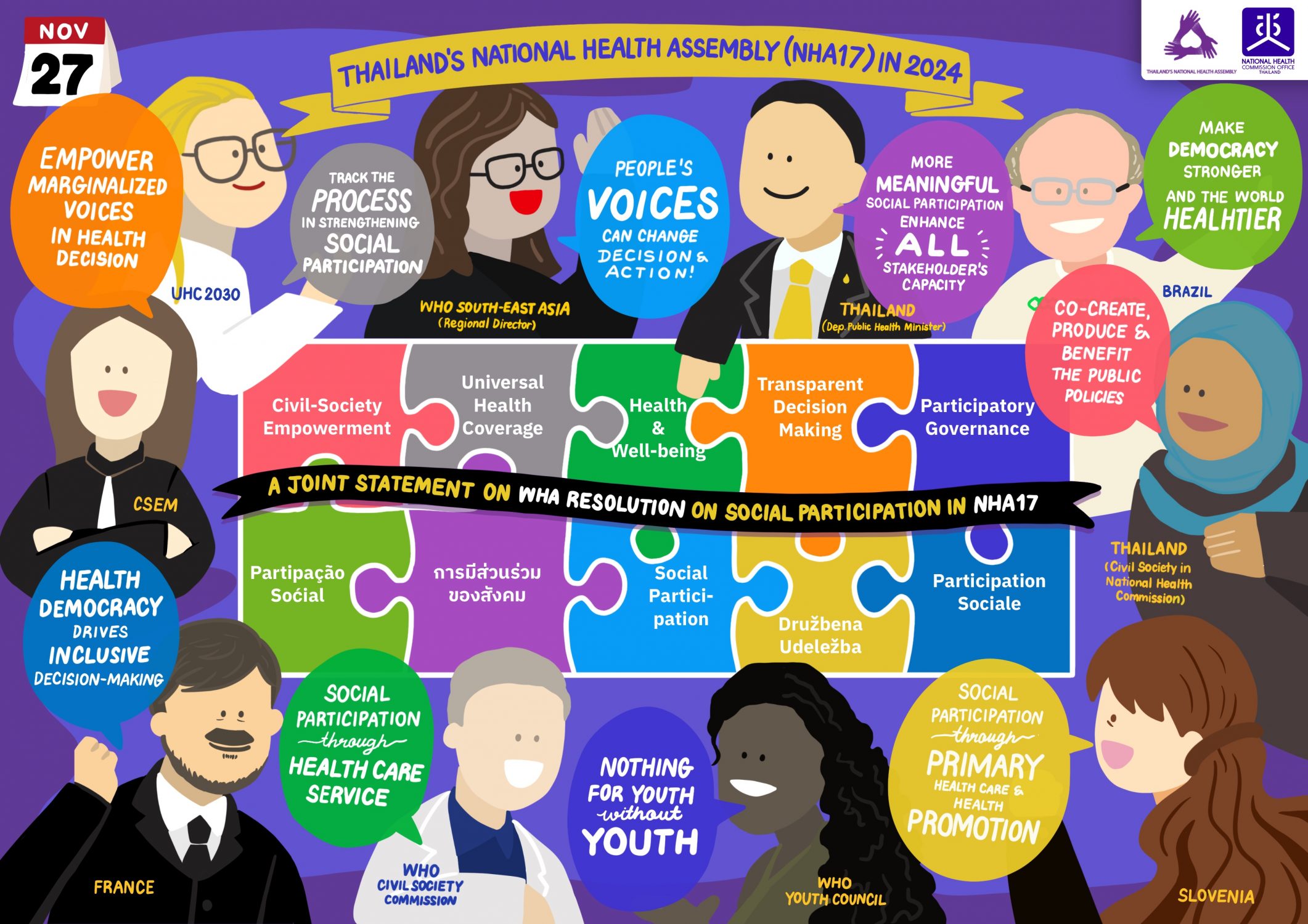 World Health Assembly, Member States endorsed Thailand’s “Social Participation Resolution” push (News by TPBS) Link: https://en.nationalhealth.or.th/world-health-assembly-member-states-endorsed-thailands-social-participation-resolution-push-2/